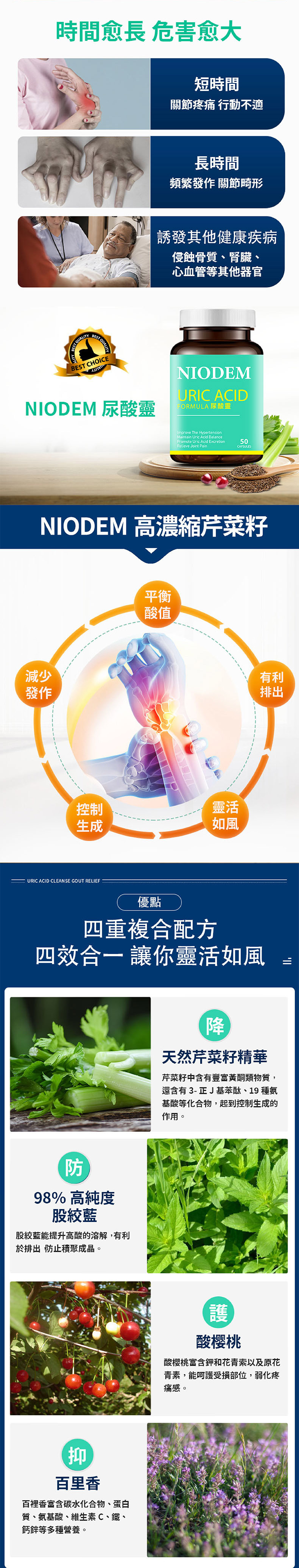 有助降低血清尿酸、 改善三高, 維持尿酸平衡;促進尿酸排泄及腎臟排毒, 保護腎臟功能;舒緩關節疼痛及腫脹, 改善痛風;減少痛風及心血管問題的發生。